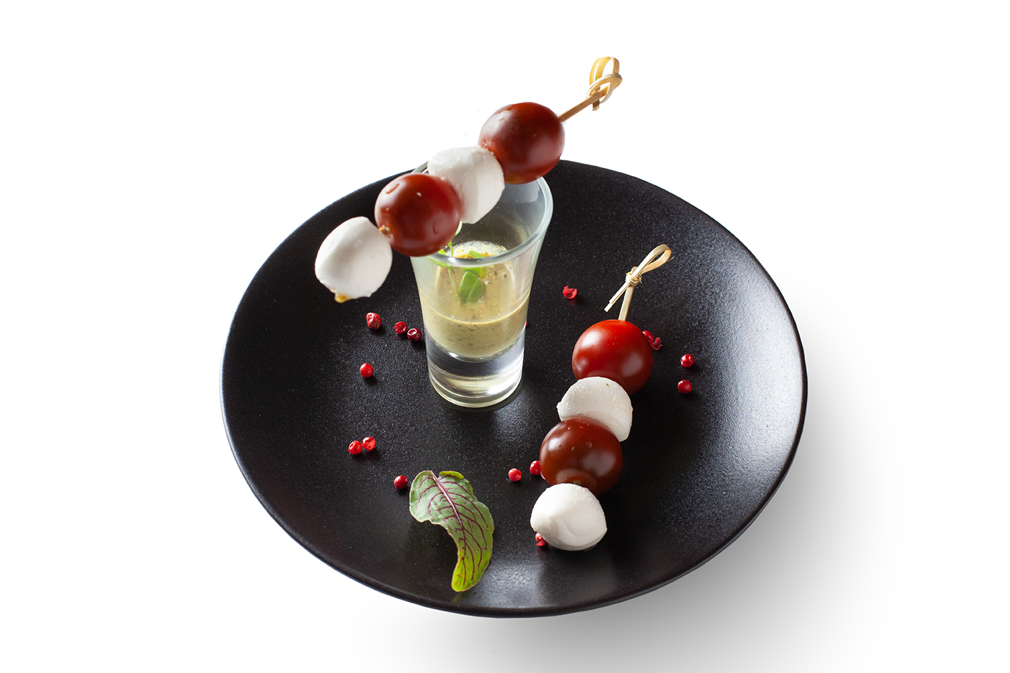 Салат «Капрезе» в удобном формате. Сыр Моцарелла и помидоры черри украшены красным базиликом и подаются на шпажках для удобства гостей.